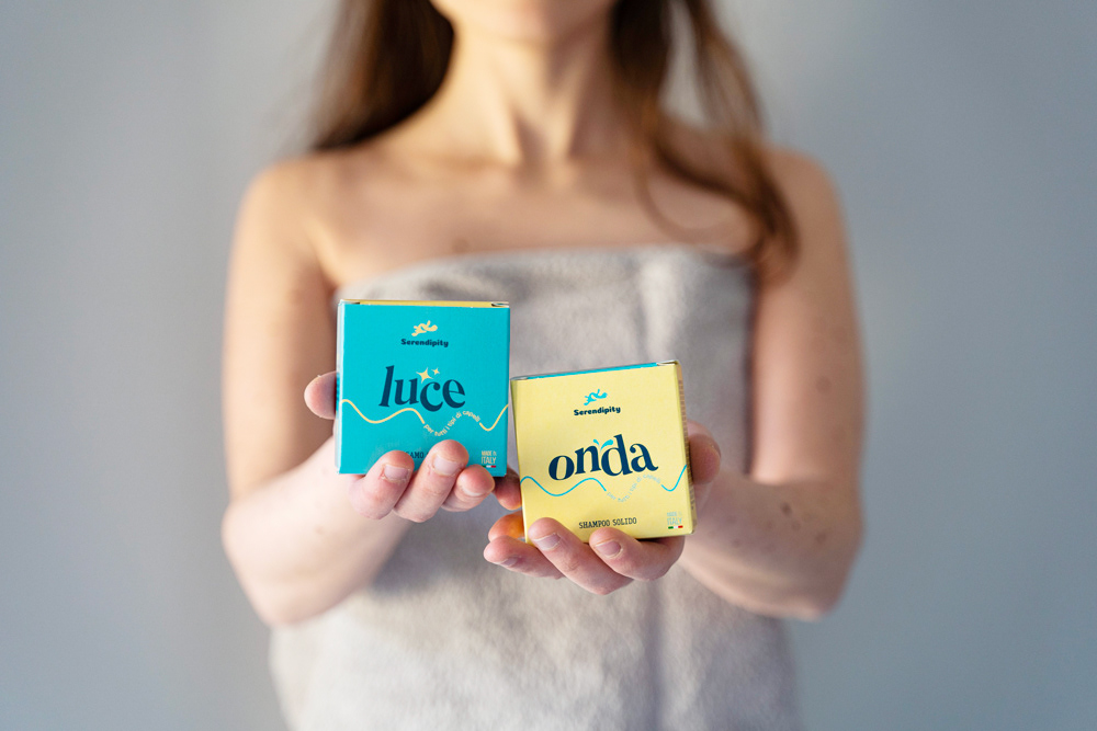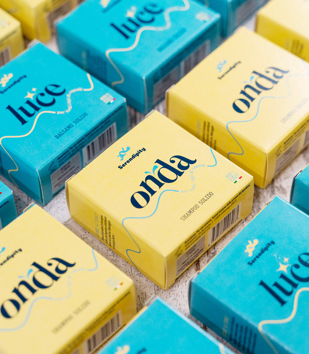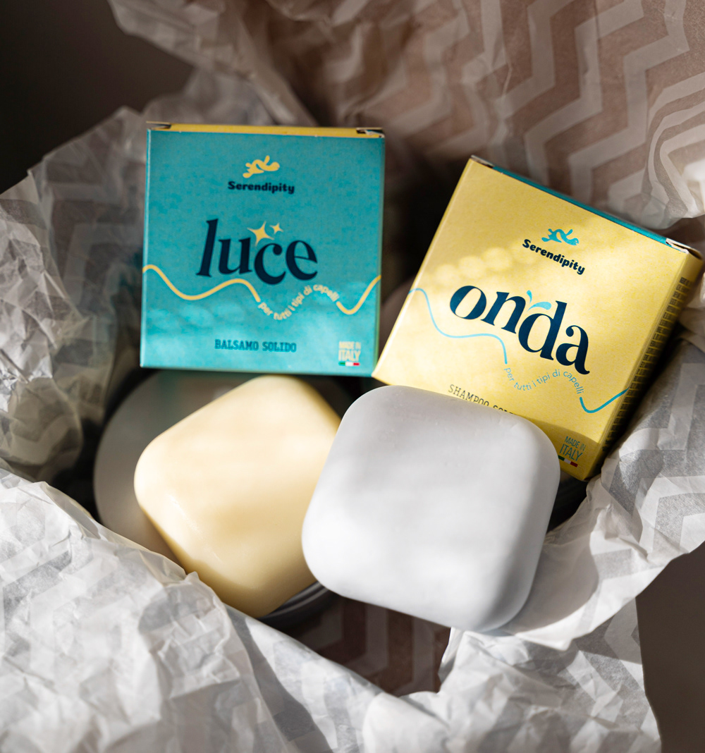 Packaging dalla grafica minimal per un balsamo e shampoo solidi firmati Serendipity.